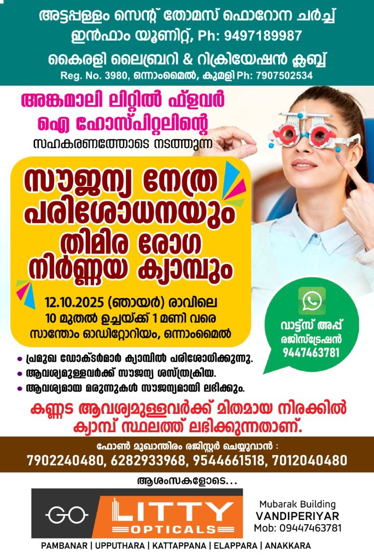 കുമളി : കണ്ണിന്റെ ആരോഗ്യം ഉറപ്പാക്കാനും, തിമിരം ഉൾപ്പെടെയുള്ള വിവിധ നേത്രരോഗങ്ങൾ നേരത്തേ കണ്ടെത്താനും ലക്ഷ്യമിട്ട്, അങ്കമാലി ലിറ്റിൽ ഫ്ലവർ കണ്ണാശുപത്രിയുടെ നേതൃത്വത്തിൽ സൗജന്യ മെഗാ നേത്ര...